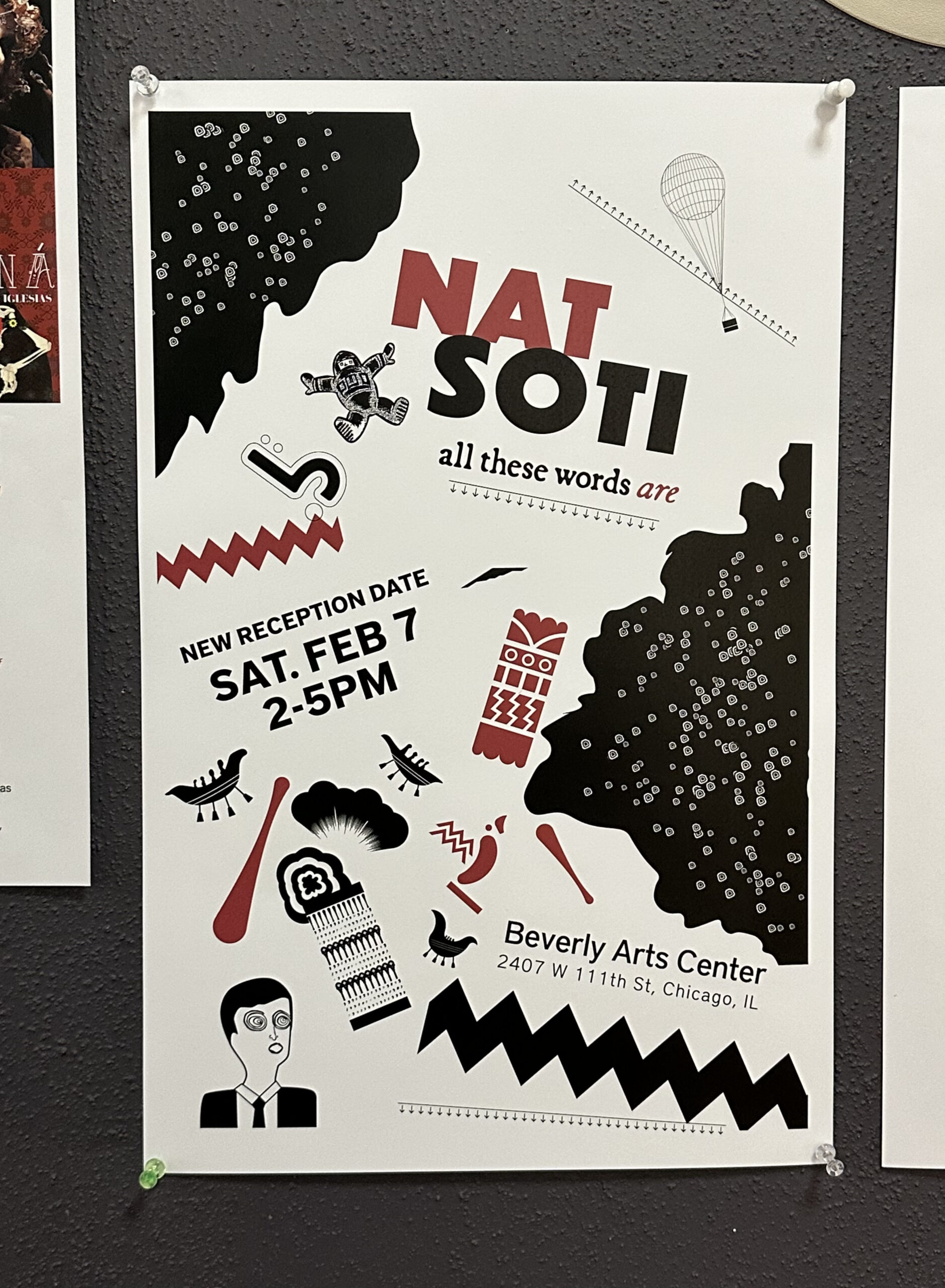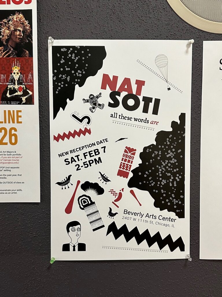 The Beverly Arts Center is hosting an exhibition by Nat Soti, an art and design lecturer at Saint Xavier University, titled “All These Words Are.” It explores the intersection of art and graphic design through visual communication and open-ended meaning.