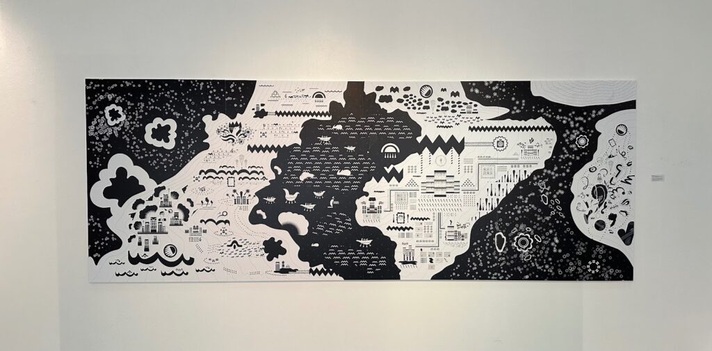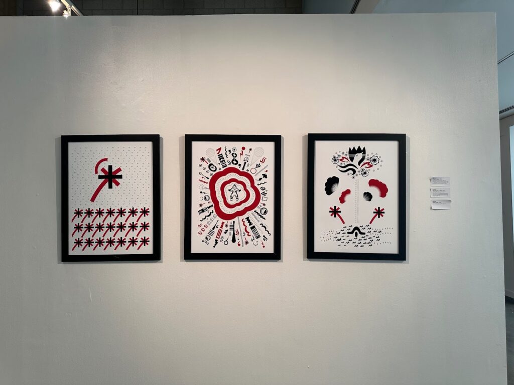 The exhibit brings together digital prints, mixed media, painting, drawing, collage, video, and motion graphics, using graphic symbols without fixed definitions to invite viewers to interpret and create meaning for the work themselves.
