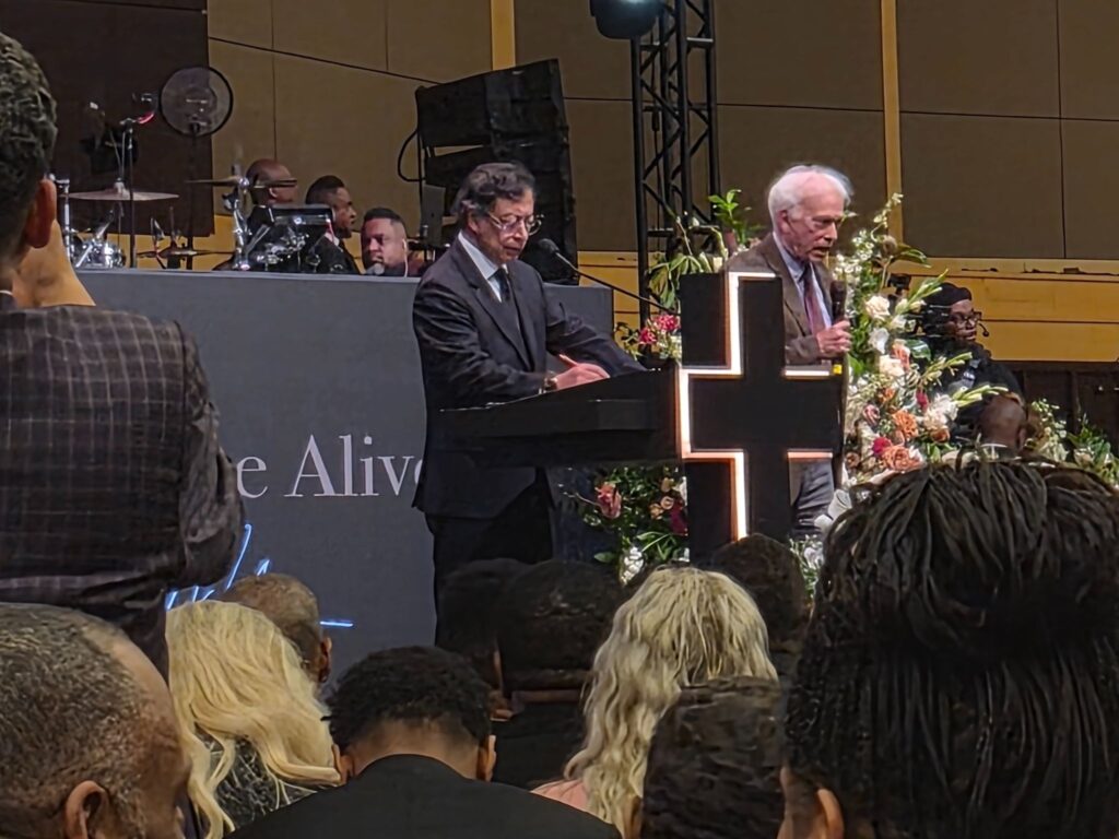 President of Colombia Gustavo Petro giving a speech in Spanish alongside an English translator during services for Rev. Jesse Jackson at the House of Hope Baptist Church on Mar. 6, 2026