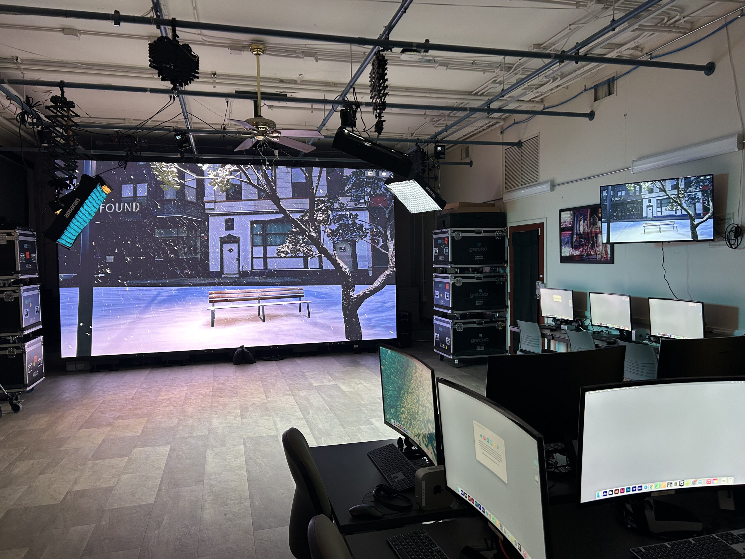 “While [the temporary studio] was up, we had an opportunity to talk to the grant people, and sort of say, ‘What if we took this to a whole other level up?’” Peck tells of his experience acquiring grant money for the studio. “And, basically, the three things we thought could make the biggest difference is brand new computers, a giant video wall, and a couple of additional cameras and a couple of additional lights. And, so, because we had [this temporary studio] up, we could ask for [a permanent one],” he further explained.